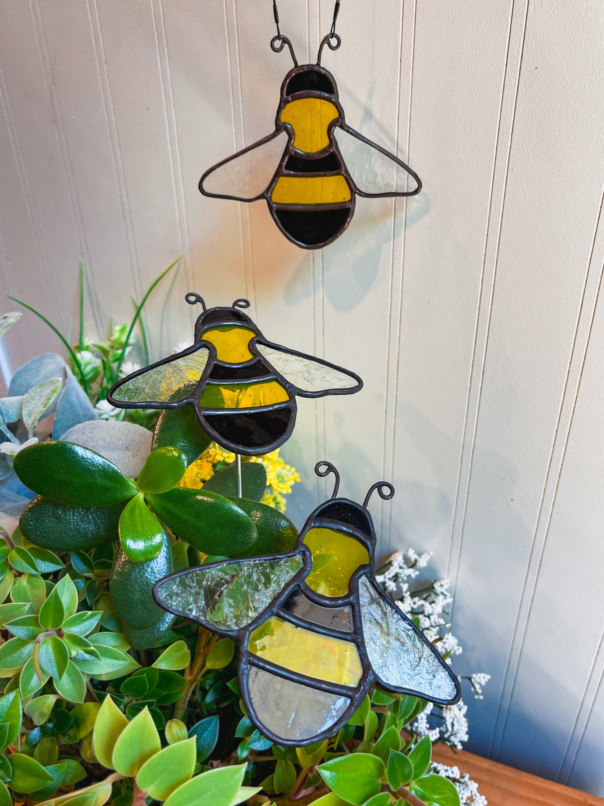 These stained glass bumble bees come as hanging suncatchers or indoor plant stakes!